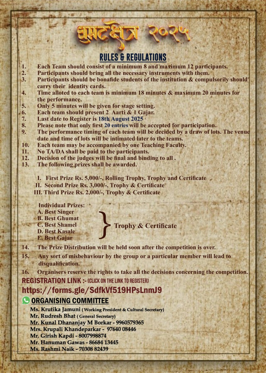 « All Events This event has passed. Ghumat Kshetra 2025 “ Where tradition meets devotion in every beat “ August 21/8:30 am « State level session on “Seeing Beyond Sight: Technology Empowering the Visually Impaired” on the Occassion of National Librarian’s day 2025 Hike to Savari Waterfall » * For Rules and Regulation -> click here Add to calendar Google Calendar iCalendar Outlook 365 Outlook Live Details Date: August 21 Time: 8:30 am Organizer Organises By Swami Vivekanand VM’s College of Commerce Phone 08322333029 Email svvmcollege@yahoo.com View Organizer Website Venue SVVM’s College Hall