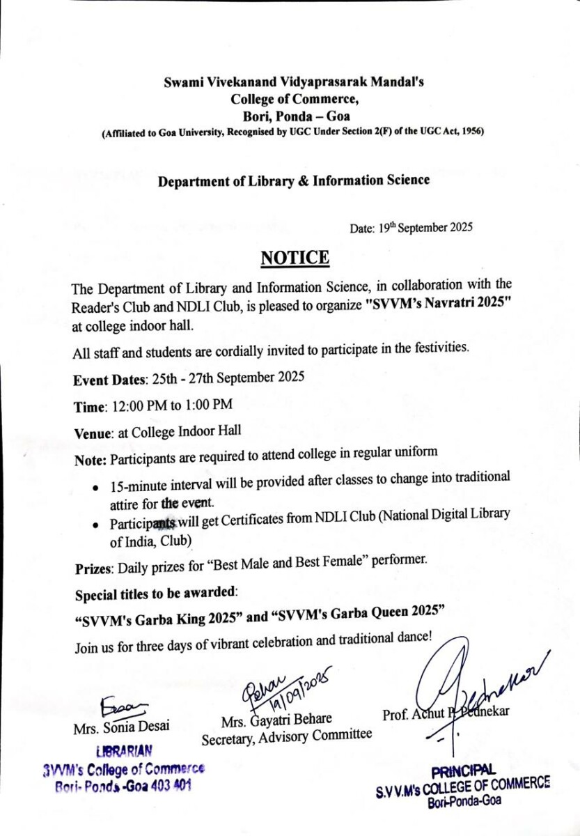 « All Events This event has passed. SVVM’s Navratri 2025 September 25/12:00 pm - September 27/1:00 pm « Blood Donation Camp Free Check up Medical Camp » * For More Details click here Add to calendar Google Calendar iCalendar Outlook 365 Outlook Live Details Start: September 25/12:00 pm End: September 27/1:00 pm Organizer Organised By Department of Library & Information Science in collaboration with Reader’s Club and NDLI Club Venue SVVM’S College Of Commerce, College Campus, Bori-Goa